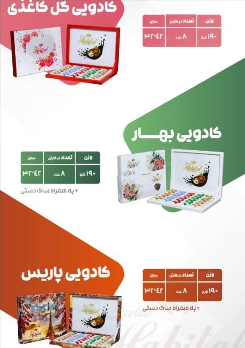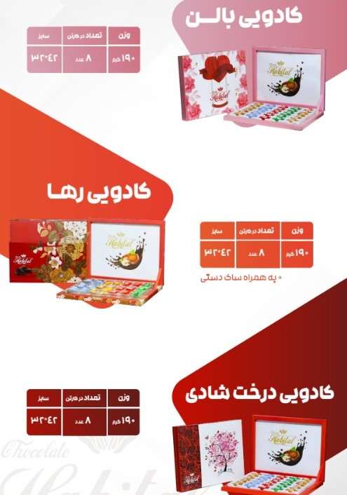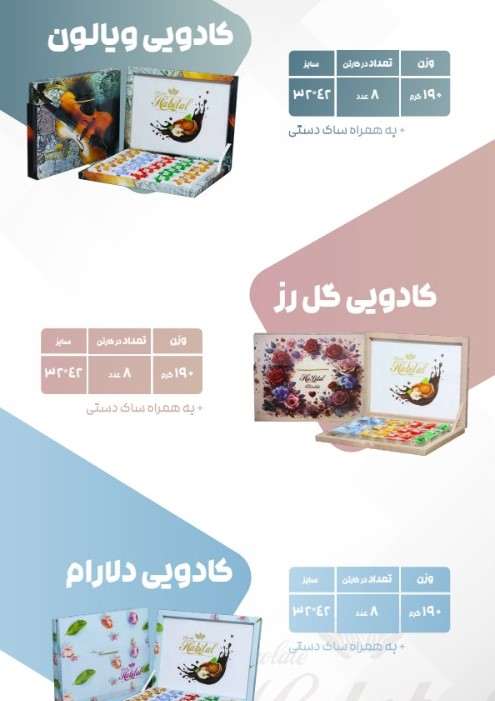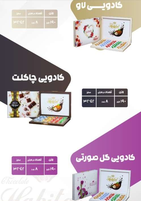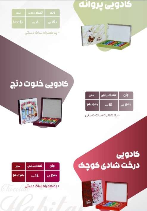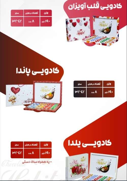 بیش از 25 مدل شکلات کادویی را در طرحها و ابعاد گوناگون تولید و به بازار عرضه کرده است.