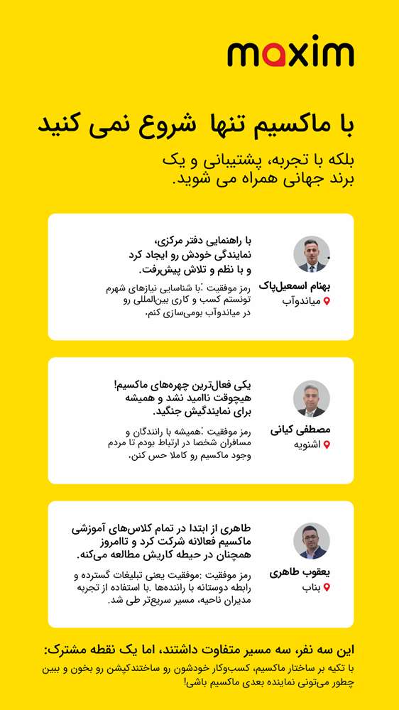 شعار ماکسیم ساده اما بلندپروازانه است. تلاش ما همیشه افزایش کیفیت تعامل میان مسافران و رانندگان بوده است تا با یاری هم به سوی اهداف خود گام برداریم.
