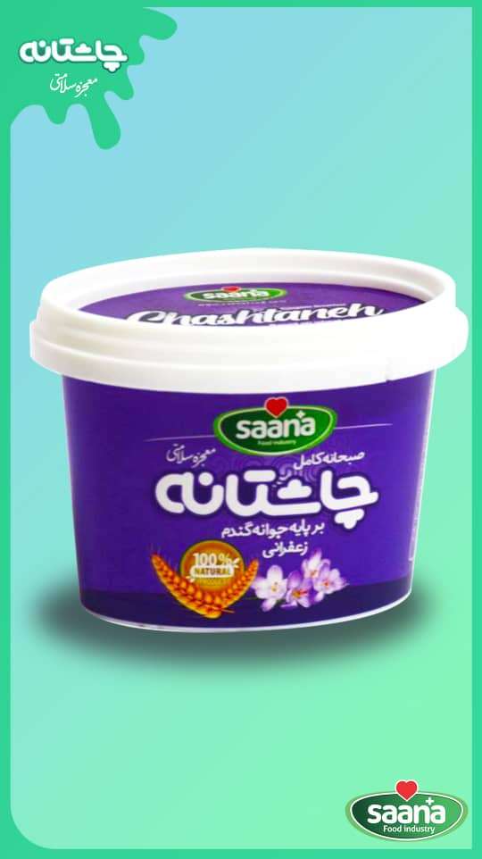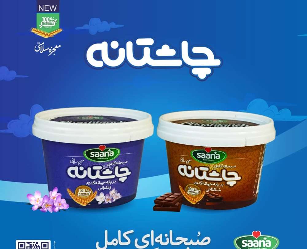 چاشتانه سانا صبحانه ای کامل بر پایه جوانه گندم است که حاوی ترکیباتی از جمله : جوانه گندم ، کاکائو ، کره حیوانی ، و عسل طبیعی و .... می باشد و محصولی منحصر به فرد و فوق العاده خوشمزه و دارای خواص غذایی بسیاری است که برای اولین بار در دنیا با طعم های : شکلاتی ، کنجدی زعفرانی و زعفرانی با وغن حیوانی توسط این شرکت تولید شده است .