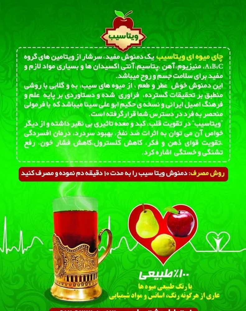 دمنوش به و سیب ویتاسیب یک دمنوش فوق العاده خوش طعم و مفید است که جایگزین بسیار مناسبی برای چای سیاه می باشد. ترکیبات این محصول شامل میوه های تازه نظیر به، سیب، گلابی، گل محمدی، بهارنارنج و ادویه های معطر است. دمنوش سیب و به ویتاسیب یک محصول صد در صد طبیعی با خواص بی نظیر است.